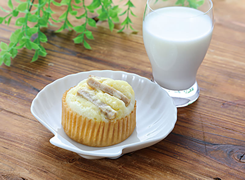 2. (1)をココット型にグラシンカップを入れ、(1)を等分に流し入れる。パラパラベーコンとミックスチーズ(各少々)をのせる。