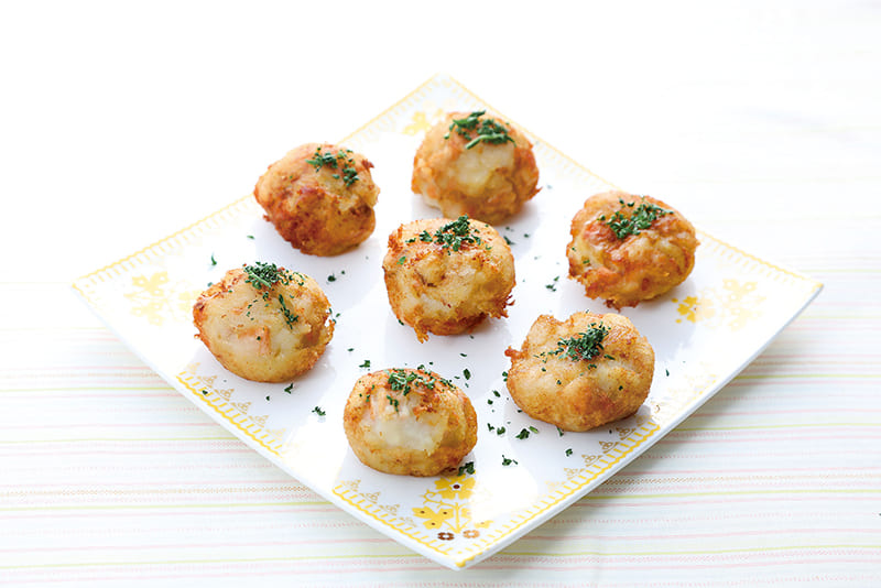 4. フライパンに多めの油を170℃に熱し、(3)を入れて転がしながら揚げ焼きにする。油を切って皿に盛る。