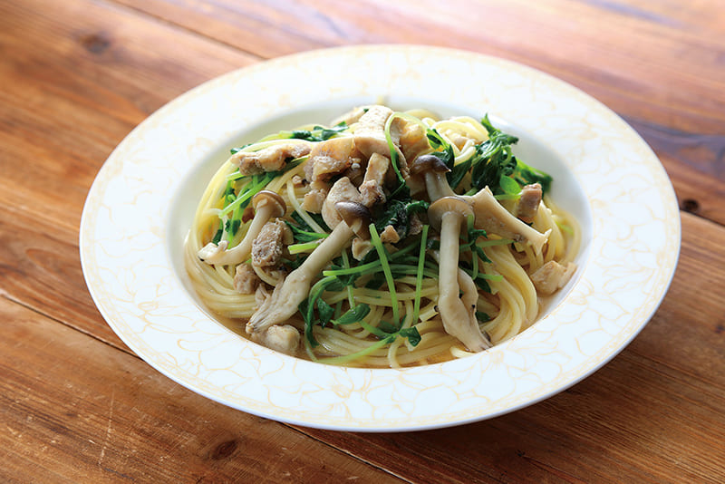 - (2)の鶏肉に火が通ったら、豆苗と(1)のスパゲッティを加えてさっと混ぜる。
